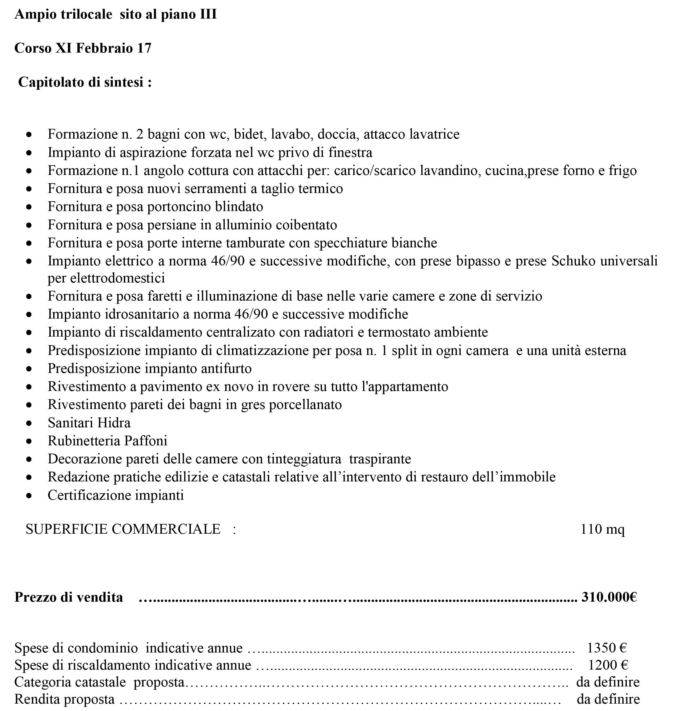 Predisposizione clima e antifurto, serramenti nuovi a taglio termico con persiane in alluminio coibentato, portoncino blindato, rivestimento a pavimento in legno di rovere in tutte le stanze.